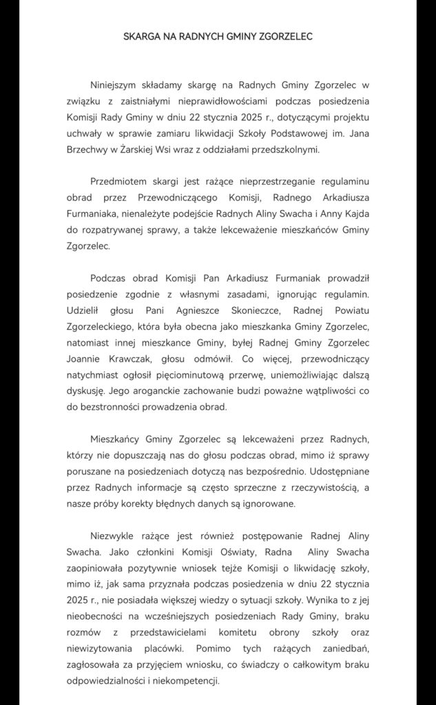 „Przedmiotem skargi jest rażące nieprzestrzeganie regulaminu obrad przez Przewodniczącego Komisji, Radnego Arkadiusza Furmaniaka, nienależyte podejście Radnych Aliny Swacha i Anny Kajda do rozpatrywanej sprawy, a także lekceważenie mieszkańców Gminy Zgorzelec” – brzmi fragment treści pisma.