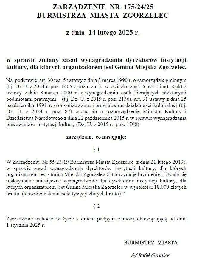 14 lutego b.r. w Biuletynie Informacji Publicznej opublikowano rozporządzenie burmistrza Zgorzelca nr 175/24/25, w którym ustala się maksymalne miesięczne wynagrodzenie dla dyrektorów instytucji kultury na poziomie 18 tysięcy złotych brutto. W obliczu problemów finansowych, z jakimi boryka się wiele gmin w tym miasto Zgorzelec, ustalenie tak wysokiego wynagrodzenia wydaje się co najmniej nieodpowiedzialne.
