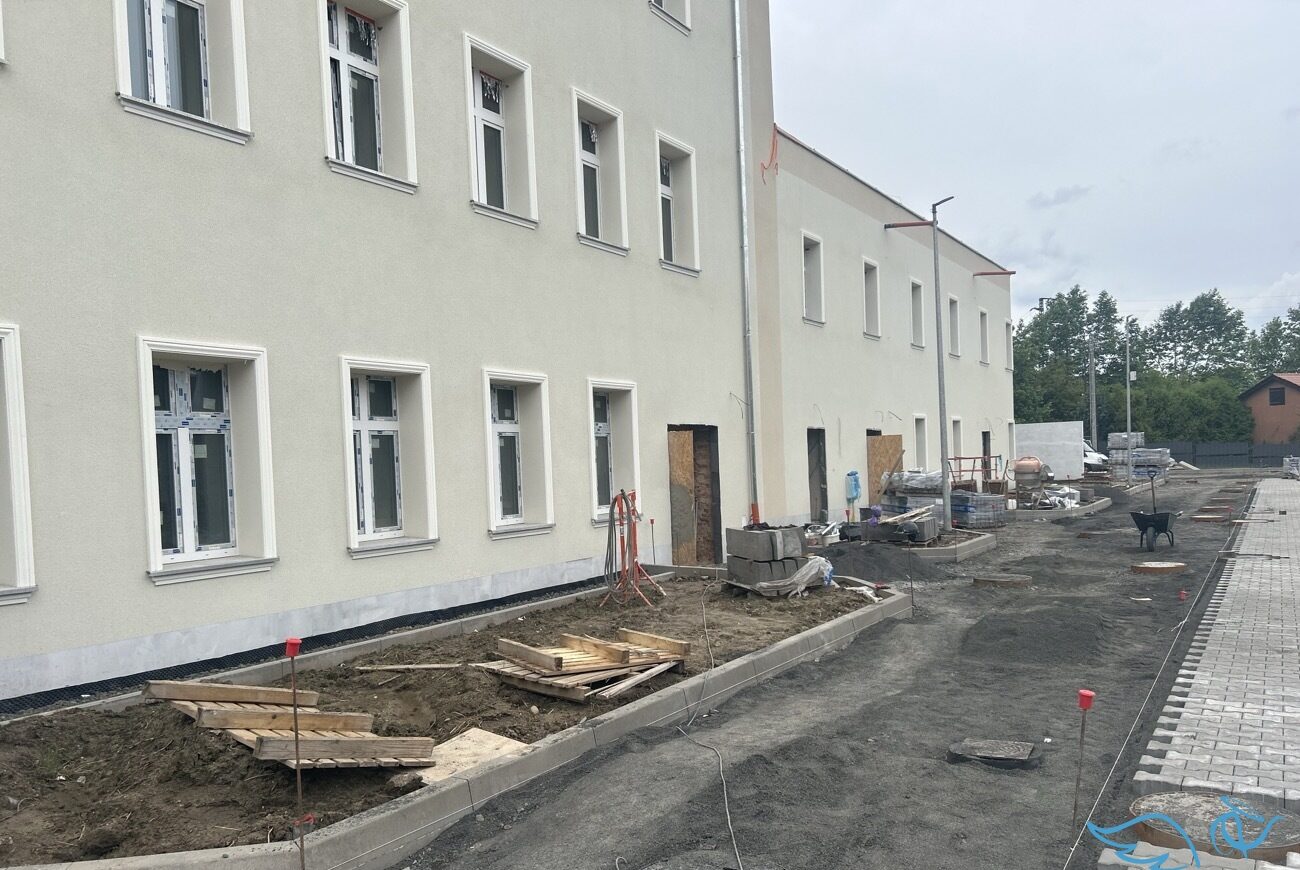 Przy ulicy Grunwaldzkiej trwa intensywna przebudowa jednego z kluczowych obiektów w mieście. Budynek przechodzi gruntowną metamorfozę, a postęp prac widać gołym okiem. Od strony ulicy Granicznej przygotowano elewację do malowania, natomiast przed obiektem trwa układanie nawierzchni z kostki betonowej.