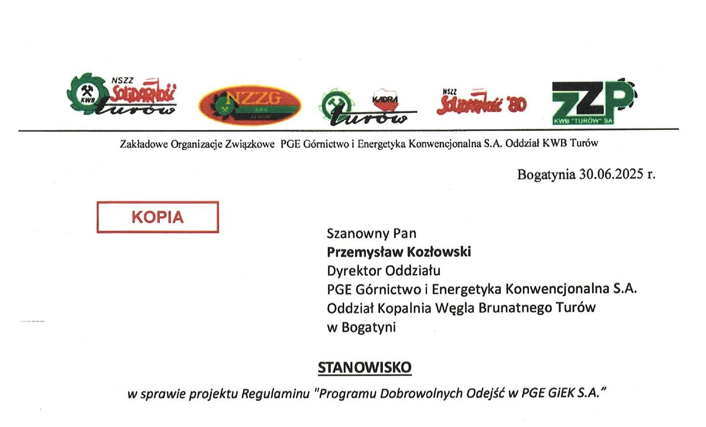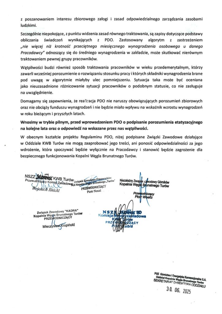 Związki Zawodowe działające w Kopalni Węgla Brunatnego Turów wyraziły zdecydowane stanowisko wobec projektu „Programu Dobrowolnych Odejść” (PDO), który planowany jest do wdrożenia przez PGE Górnictwo i Energetyka Konwencjonalna S.A. Przedstawiciele organizacji pracowniczych podkreślają, że proponowany kształt i czas wdrożenia programu może stanowić poważne zagrożenie dla funkcjonowania zakładu.